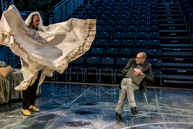 „Die Burg ist nur seitliche Deko. Am Platz kreisen drei Zuschauertribünen eine Spielfläche ein. Hier geht es um die Liebe. Und um Spaß. Und um Action. Kulissen gibt es keine. Außer einem fahrenden Bett, auf dem die verzauberte Titania den zum Esel verwandelten Zettel libidinös bedient. Vor allem seinen Schweif, der ihm bei Sturminger nicht aus dem Rücken, sondern als Monster-Gemächt aus dem Schritt wächst! Das macht Sommereffekt!“